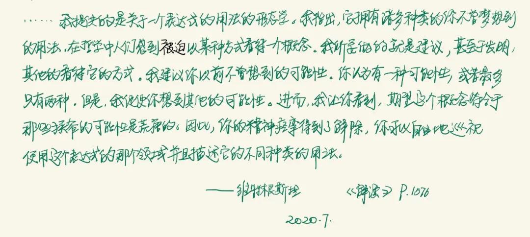 最后我想再次引用维特根斯坦的一段话:“我提供的是关于一个表达式的用法的形态学。我指出,它拥有诸多种类的你不曾梦想到的用法,在哲学中人们感到被迫以某种方式看待一个概念。我所要做的就是建议,甚至于发明其他的看待它的方式。我建议你以前不曾想到的可能性。你认为有一种可能性,或者最多只有两种。但是,我促使你想到其他的可能性。进而,我让你看到,期望这个概念符合于那些狭窄的可能性是荒唐的。因此,你的精神痉挛得到了解除,你可以自由地巡视使用这个表达式的哪个领域并且描述它的不同种类的用法。”