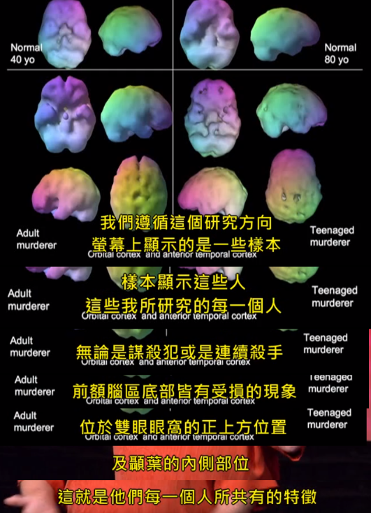 这些大脑有规律可循,比如每一个连环杀手,都在前额脑区底部(约在眼睛、眼眶的正上方)和颞叶内侧(约在太阳穴内侧)有所损伤。当然,他们彼此之间也稍微有些不同,而且脑袋也有其他的损伤。