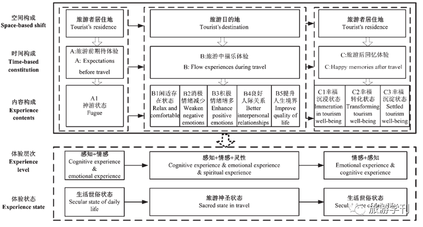 旅游者从居住地世俗生活状态进入旅游环境,通过休闲、娱乐、教育、逃避、美感和移情过程,达到消遣、逃逸、认知、审美和移情的目的;享受从生理感知、心理变化和灵性提升不同层级的生命状态,获得深刻的人生经历,再回到居住地惯常环境的历程,实现从世俗到“神圣”再归于平凡的生命状态转换。旅游前美好期待体验、旅游中福乐体验、旅游后温馨回忆体验,成为旅游幸福感的时间构成;享受闲适生活、获得旅游福乐体验、提升积极情绪、减弱不良情绪、感受人际美好,进而提升人生境界,是旅游幸福感的重要内容构成。