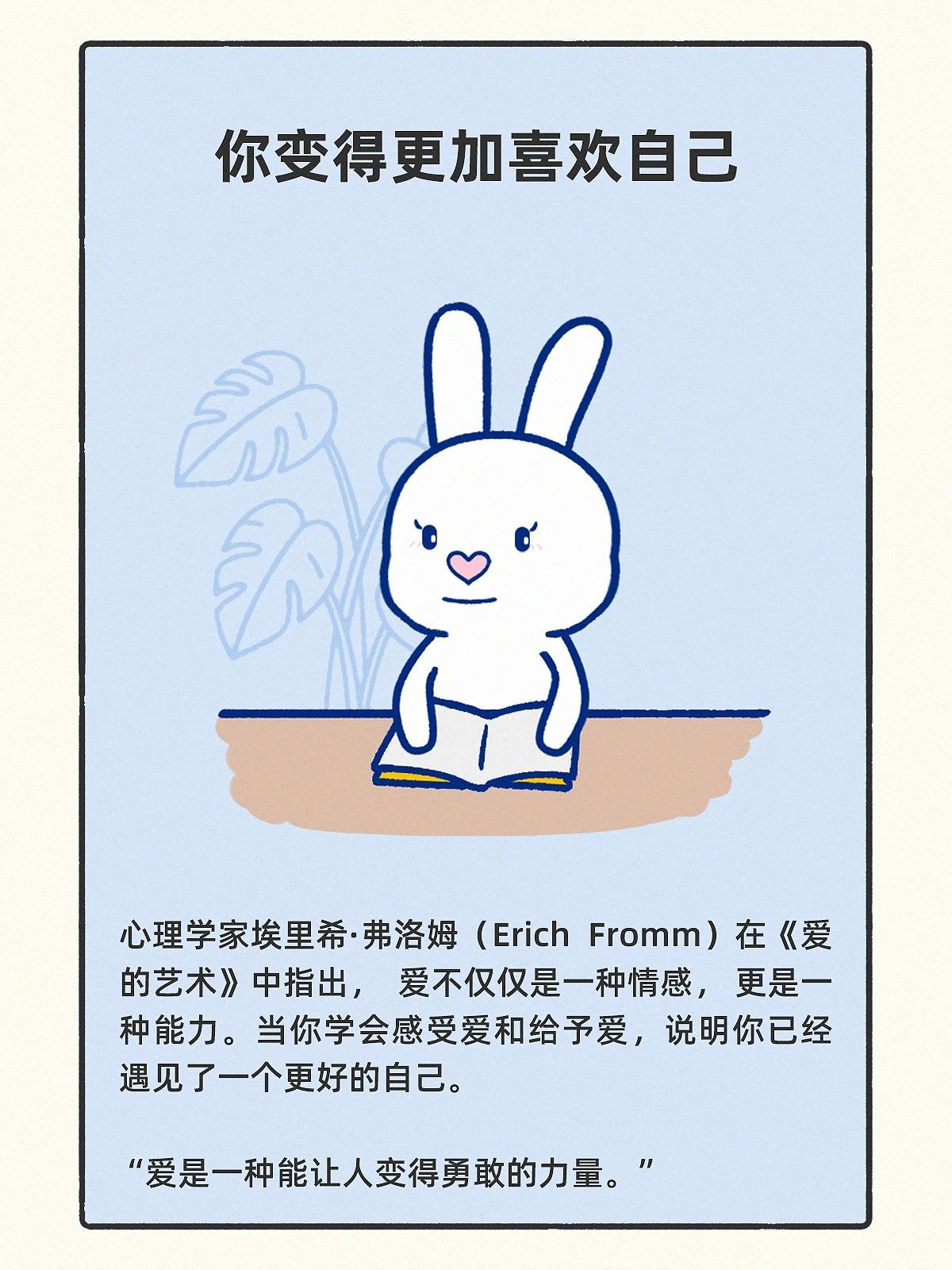 心理学家埃里希·弗洛姆(Erich Fromm)在《爱的艺术》中指出, 爱不仅仅是一种情感,更是一种能力。当你学会感受爱和给予爱,说明你已经遇见了一个更好的自己。