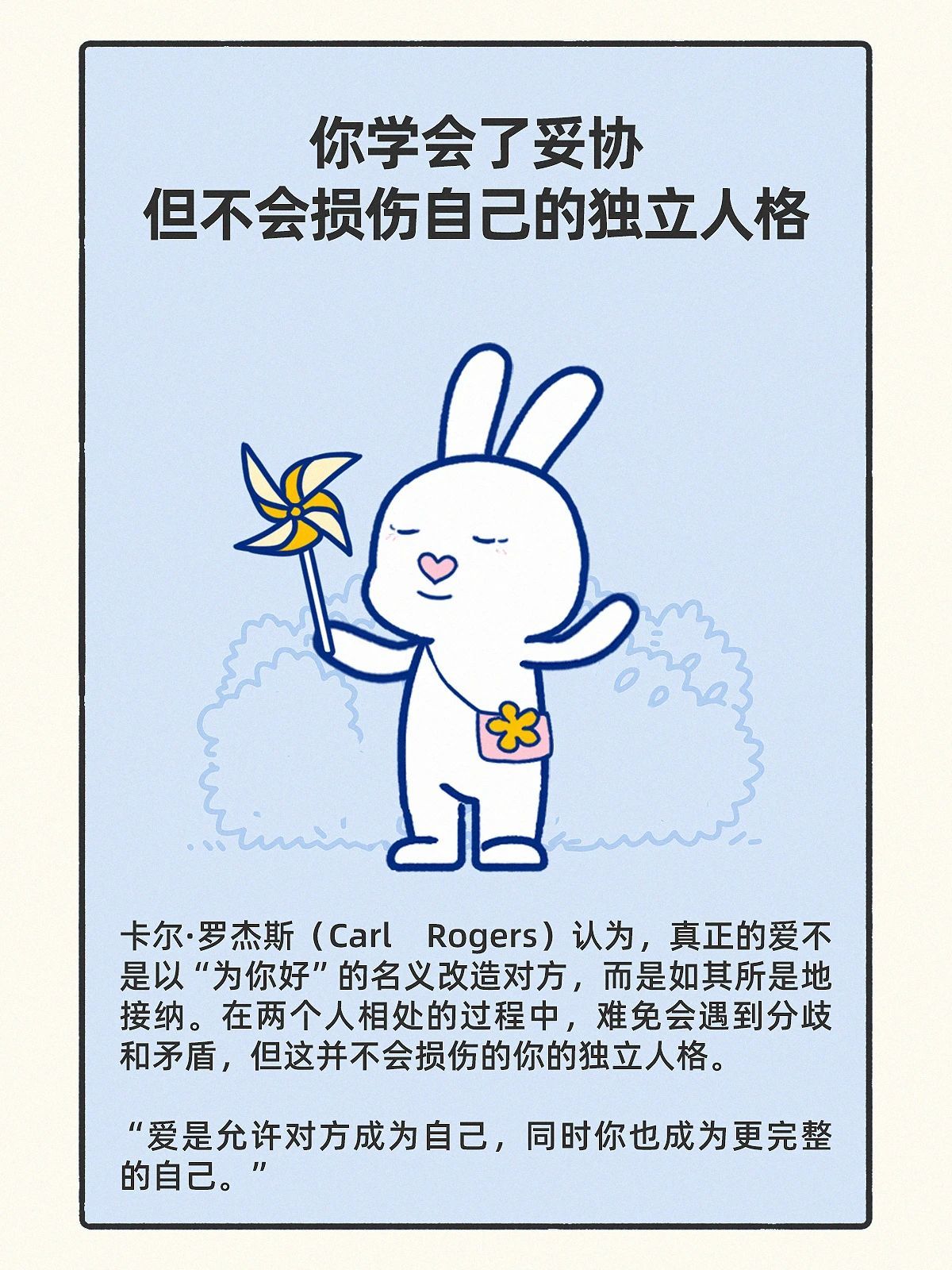 卡尔·罗杰斯(Carl Rogers)认为,真正的爱不是以“为你好”的名义改造对方,而是如其所是地接纳。在两个人相处的过程中,难免会遇到分歧和矛盾,但这并不会损伤的你的独立人格。