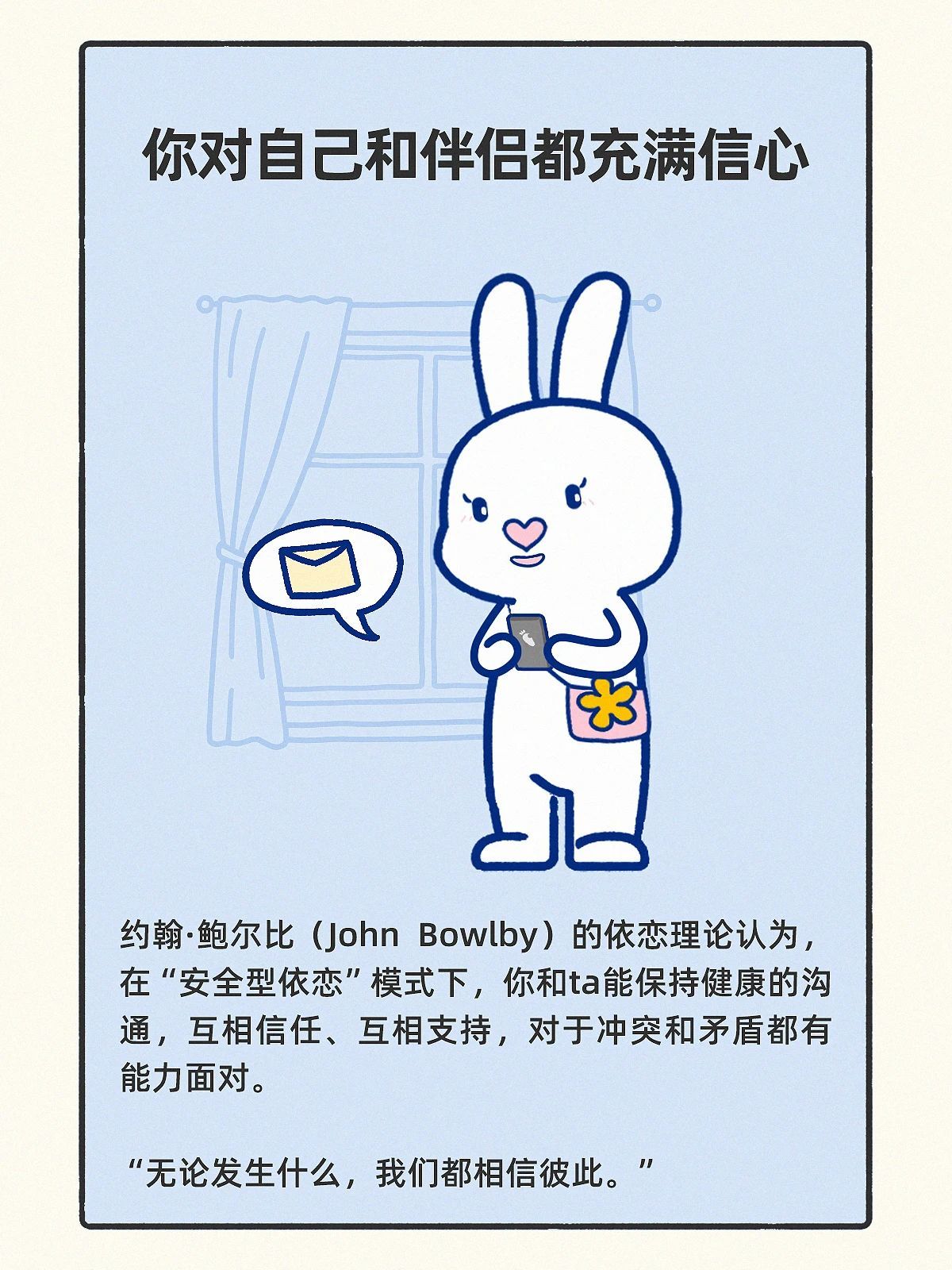 约翰·鲍尔比(John Bowlby)的依恋理论认为在“安全型依恋”模式下,你和ta能保持健康的沟通,互相信任、互相支持,对于冲突和矛盾都有能力面对。