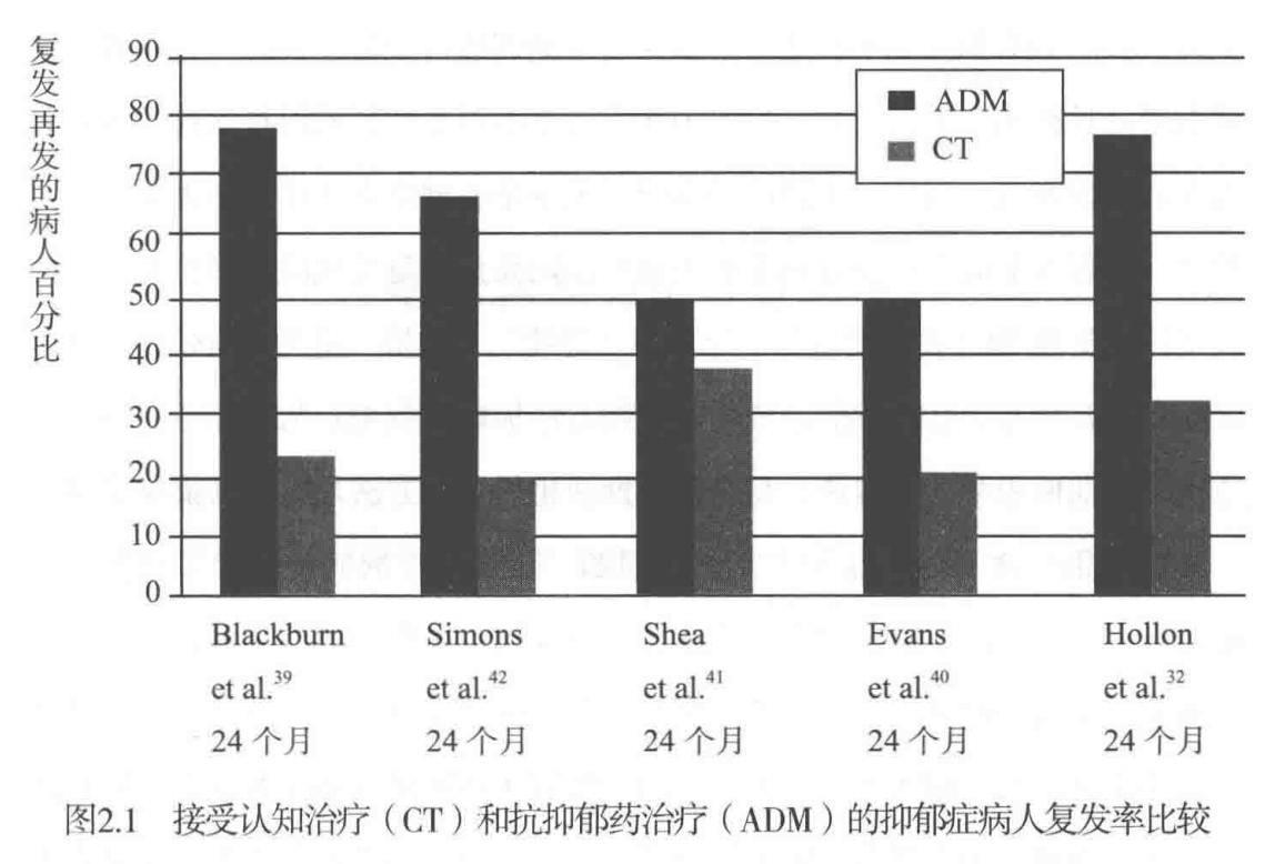 下图总结了很多实验研究,发现认知疗法(CT)与服用抗抑郁药治疗(ADM)相比,抑郁的复发率明显降低。(图片选自《抑郁症的正念认知疗法》一书)