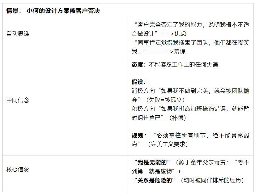 CBT通过“核心信念-->中间信念-->自动思维”这一框架来构建个人的“自我认知”系统:其中核心信念(Core Beliefs)涉及个体对自我的整体性看法;中间信念(Intermediate Beliefs)是自我核心信念在具体生活领域(如职场、关系)的衍生,以态度、假设、规则形式指导行为,是自动思维的直接来源;自动思维(Automatic Thoughts)是个体在具体情境中无意识涌现的瞬时想法,涉及具体情境与个人的关系,是整个自我认知框架中最表层的部分,个人的情绪及行为反应取决于自动思维而非事件本身,可以通过以下案例来呈现。