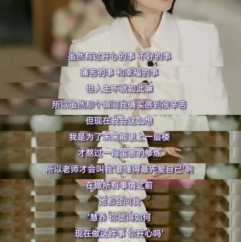 她一度陷入焦虑中,直到编剧卢熙京点醒她:“你必须懂得如何把自己摆在第一顺位”,她才开始重新审视自己。