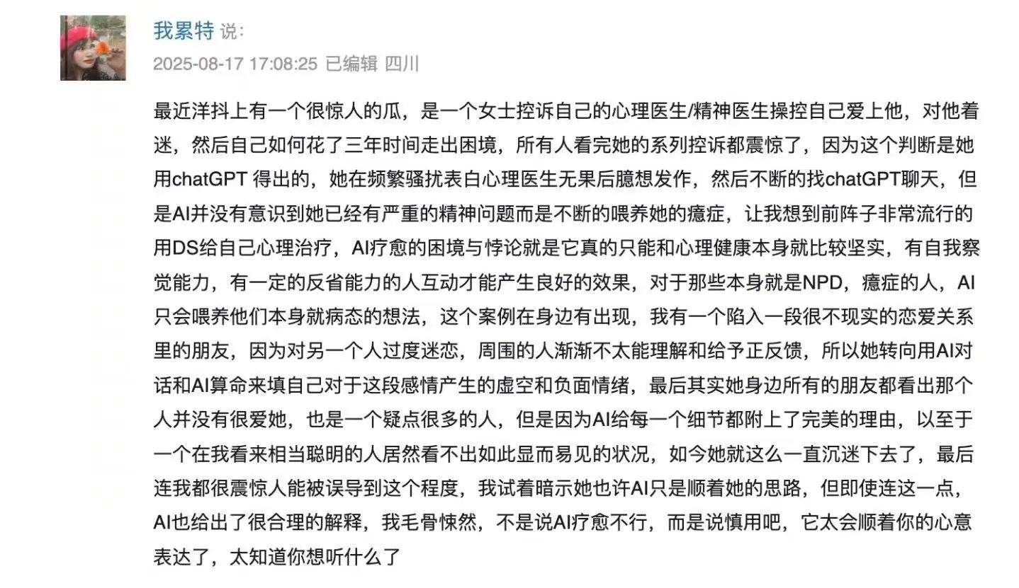 但如果说你情绪上勉强还能hold住,并不建议有事没事就拿AI当心理咨询师用。假如长期有事没事就用AI咨一把,实际上是把自己调节情绪的能力外包给AI了,而且也容易像上文中的例子一样产生脱离现实的幻想。