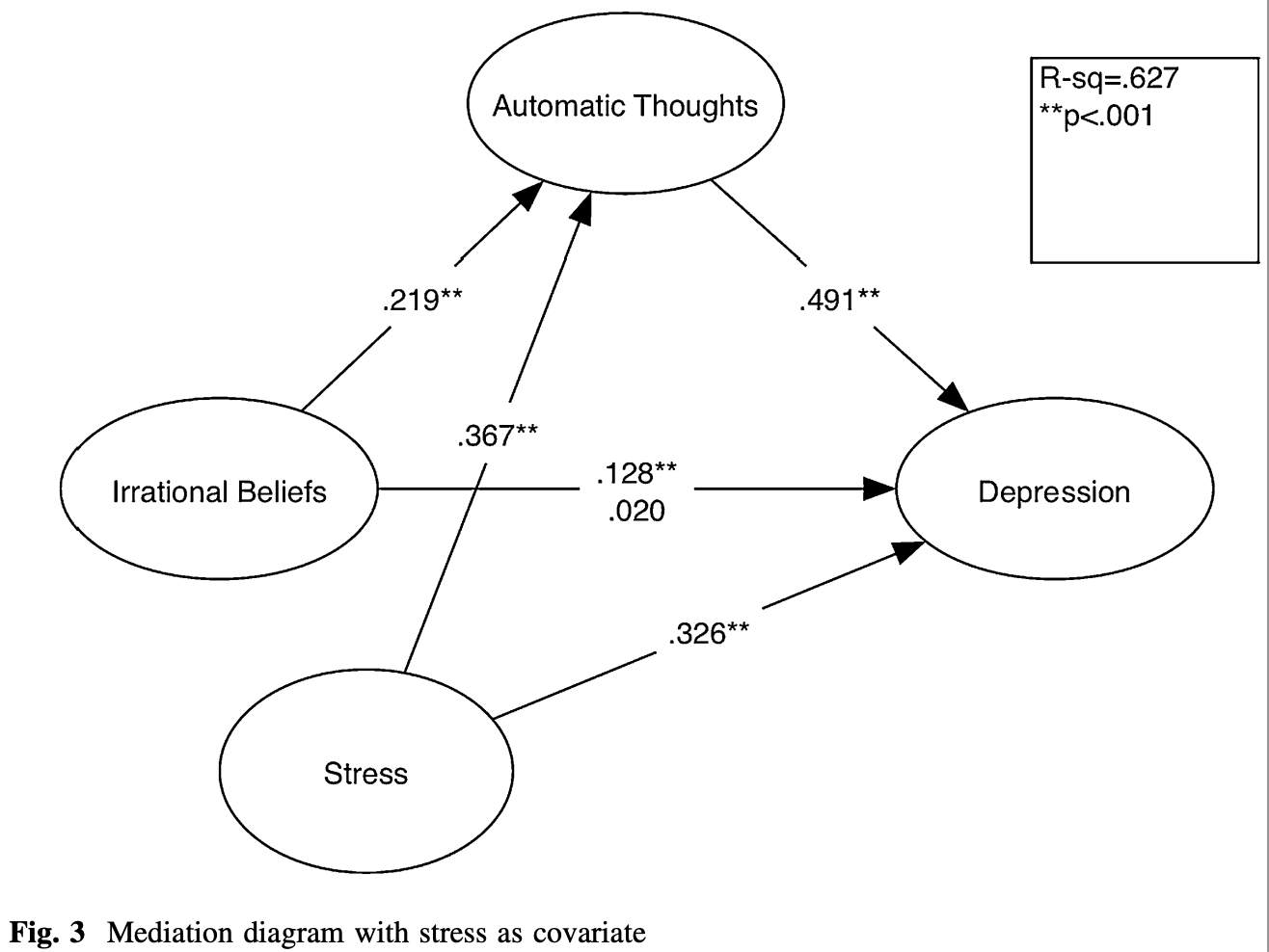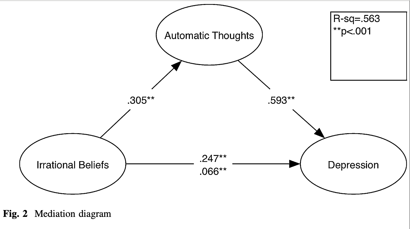 一项研究探讨了非理性信念(REBT理论)和自动化思维对抑郁和焦虑情绪的影响[2]见下图
