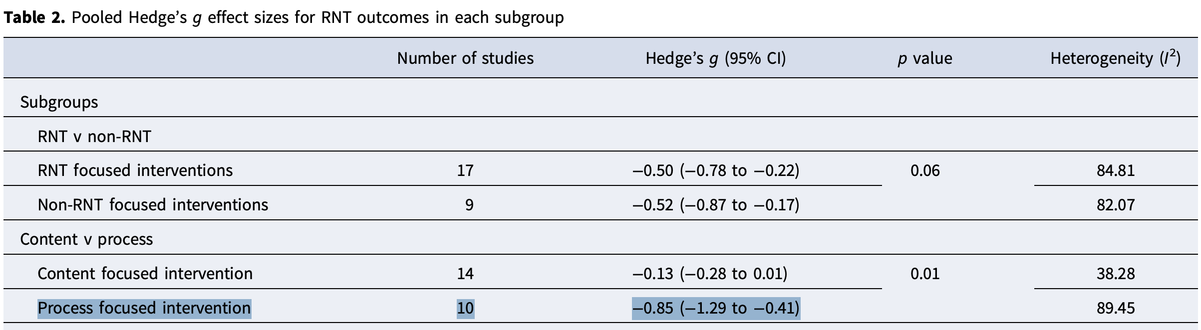 然而,进一步的分析发现(见上图),相较于聚焦于矫正具体思维内容的传统认知干预(如挑战“我没用”“我很失败”等具体消极想法),那些着眼于改变思维过程本身的治疗方式(如正念练习、认知解理、元认知干预等)在减少重复性消极思维RNT方面具有更显著的效果。