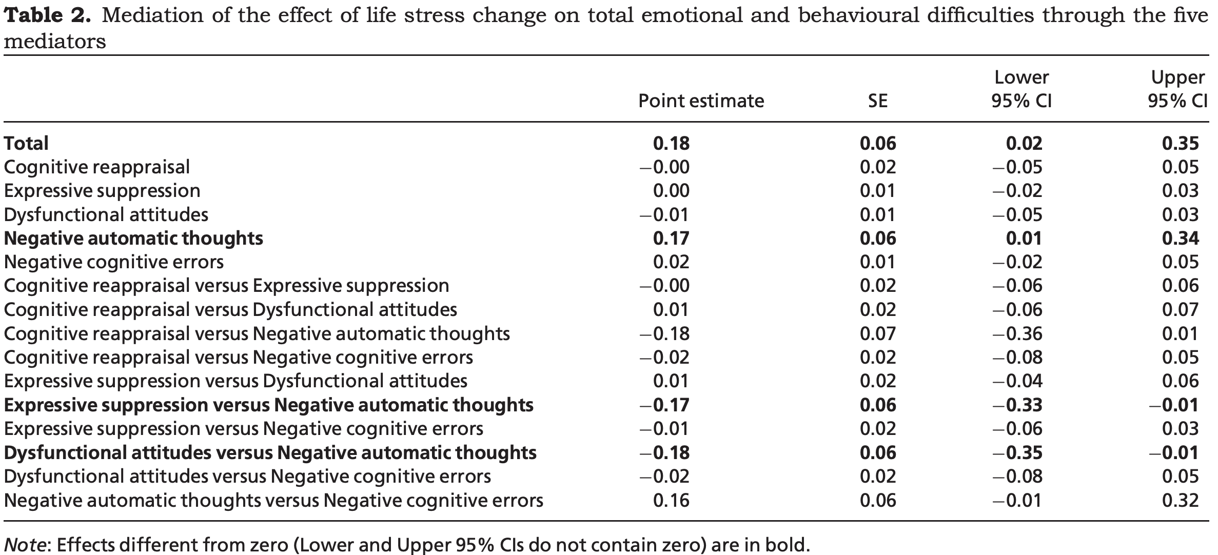 分析中控制了性别、年龄、族裔、特殊教育需求和家庭贫困等变量。结果表明,五个变量整体上可解释生活压力变化对青少年情绪与行为问题的影响,但在所有中介中,只有负性自动化思维显示出显著的独立中介效应「4」。