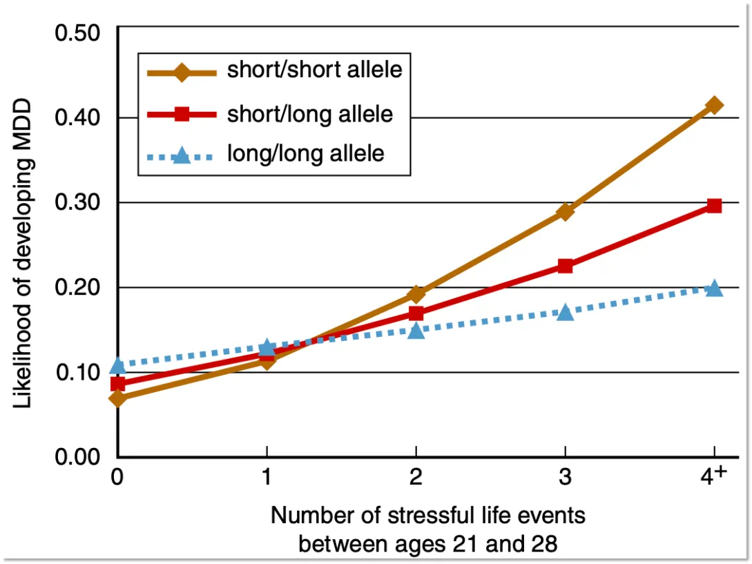 以抑郁障碍为例,已有研究表明含有一份或双份短臂5-HTT等位基因个体,在经历压力性生活事件后,更易发展出抑郁障碍,然而拥有两份长臂等位5-HTT转运基因的个体因创伤事件严重程度的增加而增加罹患抑郁症的风险较小(见下图)。