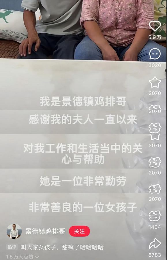 “鸡排哥”对着镜头坚定地说:“我人生中最大的成功是选对了老婆。她品性好、性格好、辛勤劳作,对人真诚友善。”