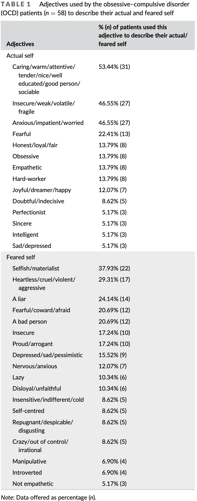 一项针对58 位 OCD 患者的访谈中,研究者发现患者(53.4%)普遍将自己的“真实自我”描述为关爱、有教养、善良、体贴,同时(约46.5%)又常带有焦虑、脆弱、不安、易受伤的特质。见下图