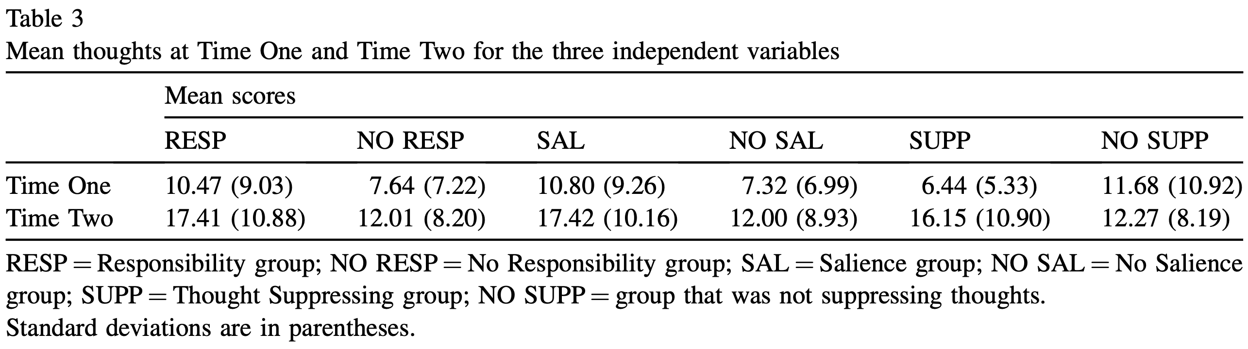 Fritzler, B., Hecker, J. E., & Fawzy, T. I. (2008). From intrusive thoughts to obsessions: The role of perceptions of responsibility, salience, and thought suppression. Journal of behavior therapy and experimental psychiatry, 39(4), 610-624.