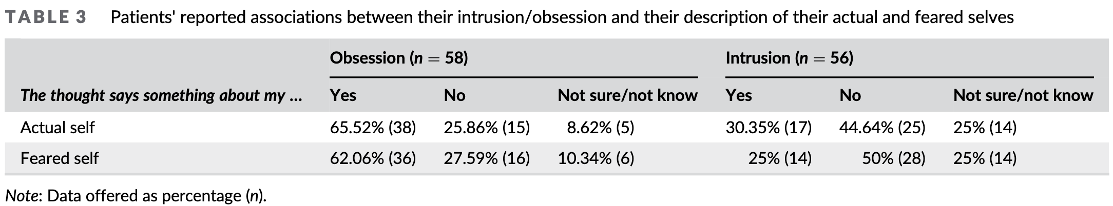 约三分之二的患者认为自己的强迫观念(obsessions)反映了真实的自我(actual self),并认为这些念头使自己更接近“害怕成为的那种人”(feared self),如“自私”、“变态”“具有攻击性”或“懦弱”等负面特质。