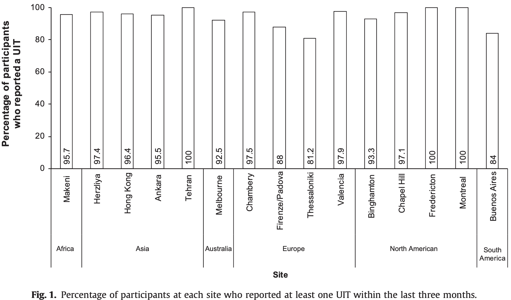 结果表明(见上图),93.6% 的参与者在过去三个月中至少经历过一次侵入性思维(UIT)。无论地区或者文化,大多数样本点的报告率都在 95% 左右或显示出更高水平的侵入性思维,因此侵入性思维在正常的群体里也是极其普遍的心理现象。