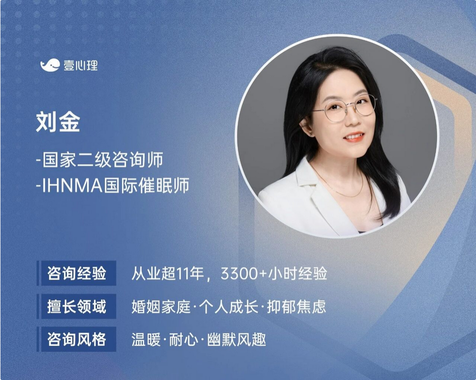 刘金老师是国家二级心理咨询师,从业超11年,服务时长3300+小时,擅长以萨提亚疗法、叙事疗法等技术帮助来访者解决个人成长、抑郁焦虑、婚姻家庭等议题。