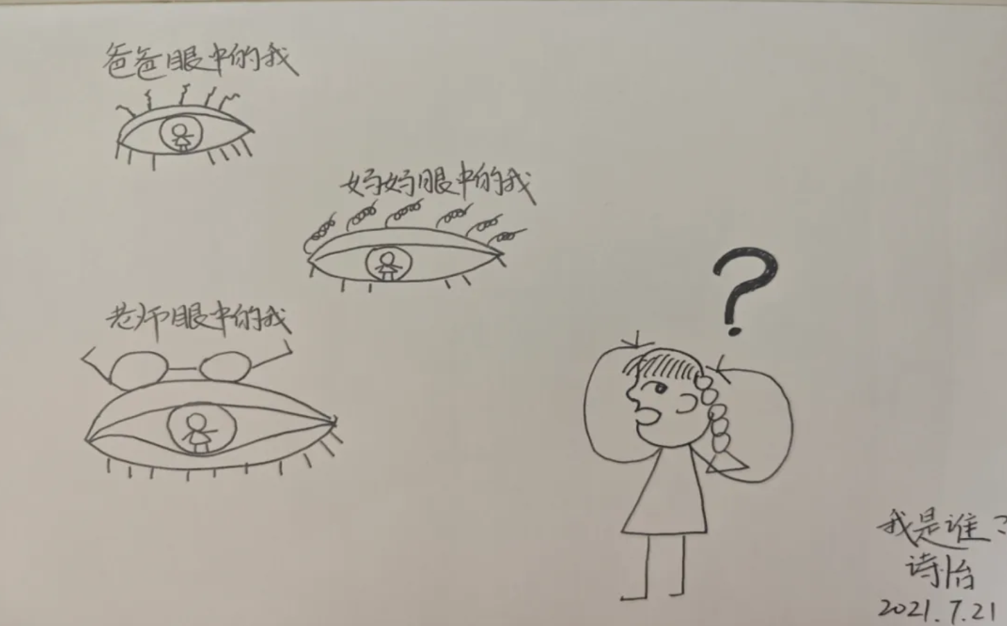 里面画了三只眼睛,分别代表着“爸爸眼中的我”“妈妈眼中的我”和“老师眼中的我”,旁边站着一个摸着头、头顶画着大大的问号的小女孩,她似乎在疑惑。