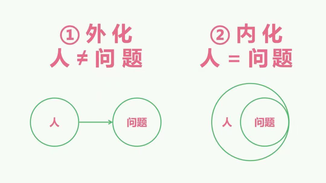 “外化”是叙事对话里很重要的态度。其对应的是人=问题的“内化”态度。在“内化”的态度里,人们逐渐相信问题是内在的,自己或他人就是问题所在。这种信念只会让他们更深陷于想要解决的困境中。