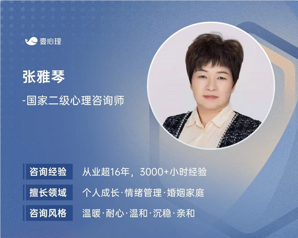 张雅琴老师是国家二级心理咨询师,从业超16年,服务时长3000小时+。
