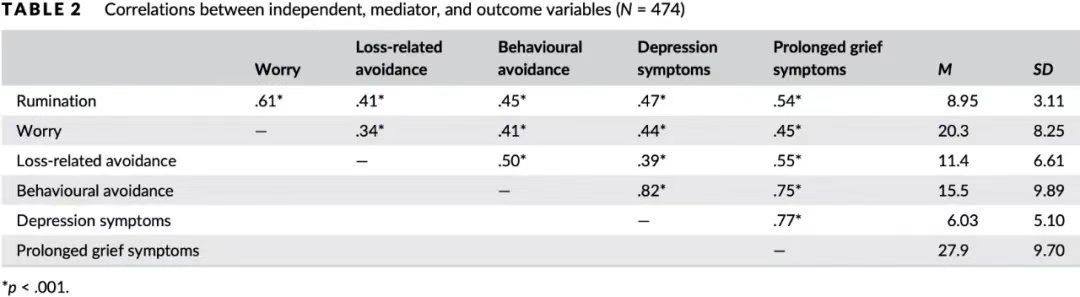另一项研究聚焦于重复性消极思维(repetitive negative thinking)尤其是反刍与担忧在丧亲个体心理障碍中的作用机制。研究共招募了474名近期丧亲的成年人(82%为女性),评估了个体的反刍水平、担忧、丧失相关回避、行为回避,以及抑郁症状与延长性哀伤症状的严重程度之间的关系。