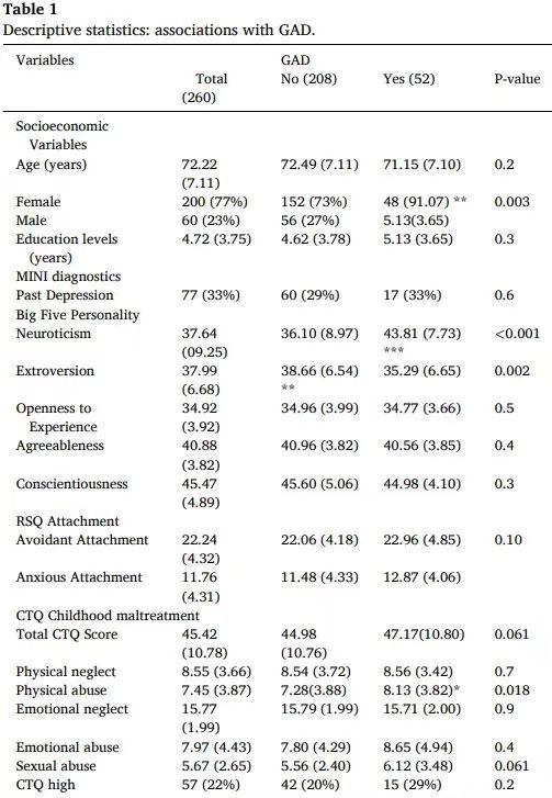 一项来自巴西的研究样本共260名参与者,平均年龄72岁左右。结果显示,童年被虐待经历可能是GAD的重要早期风险因素之一。老年群体中广泛性焦虑的患病率为20.6%(n = 52),其中29%的个体报告曾在童年遭受过虐待。