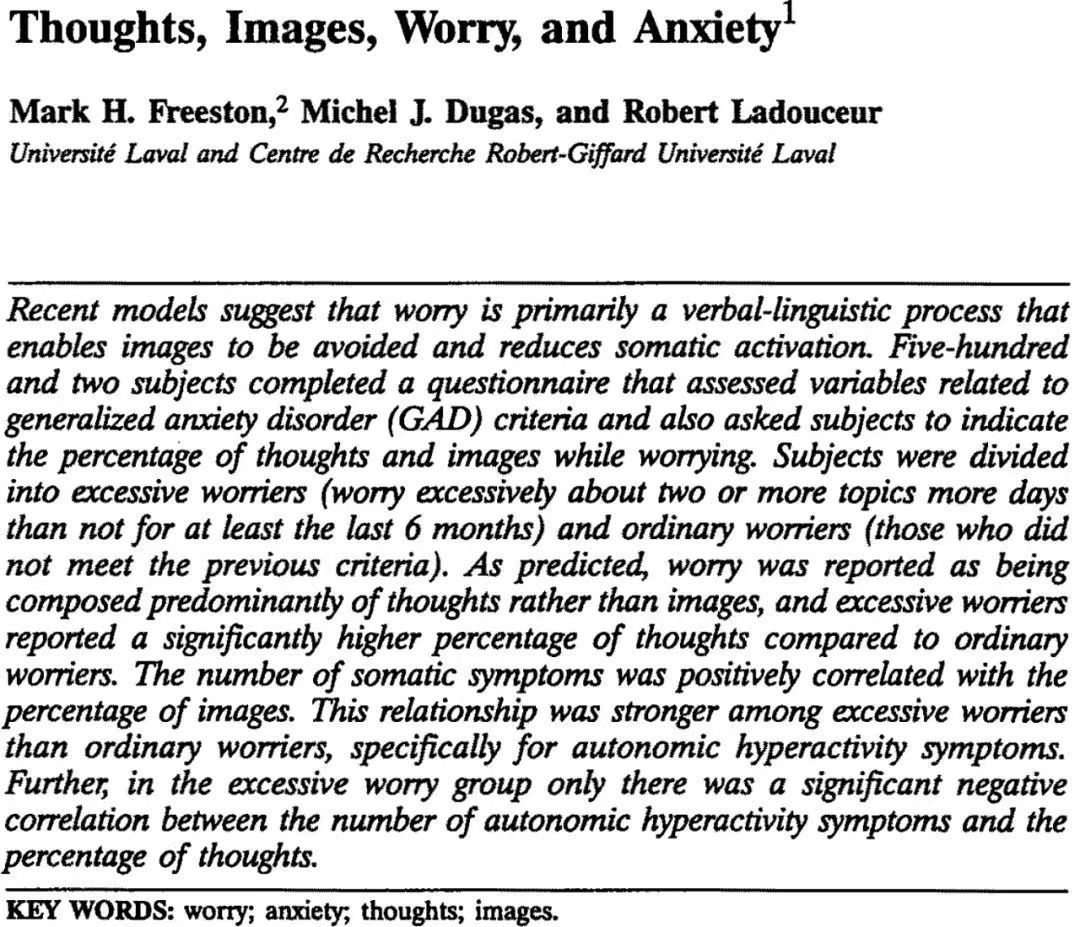 Freeston, M.H., Dugas, M.J. & Ladouceur, R. Thoughts, images, worry, and anxiety. CognTher Res20, 265–273 (1996). https://doi.org/10.1007/BF02229237
