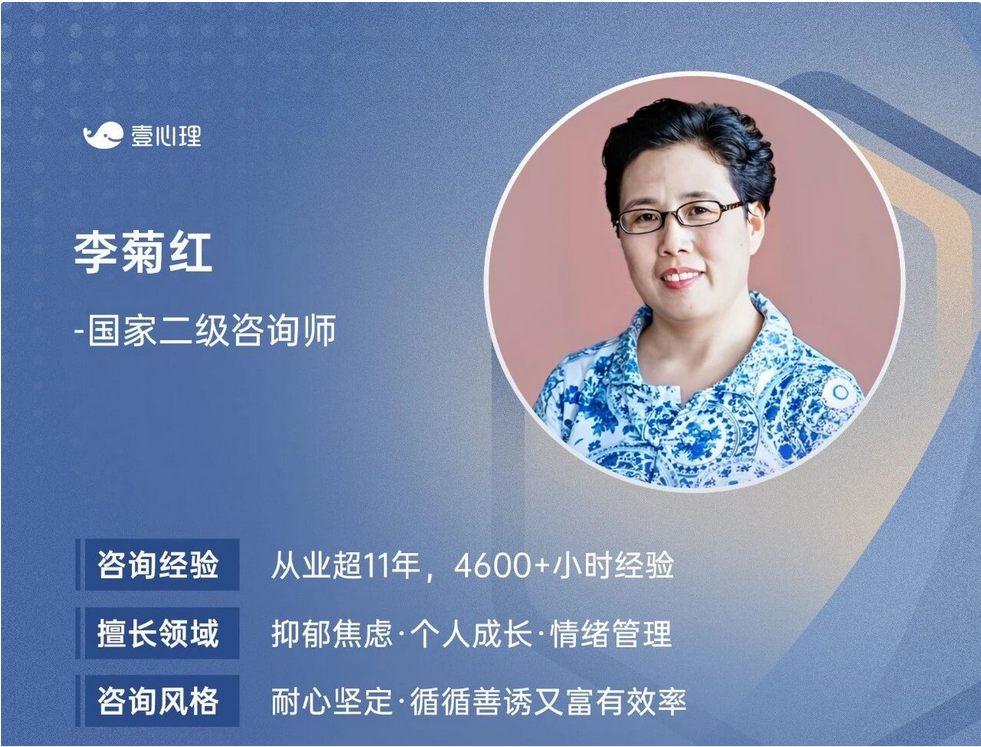 李菊红老师是国家二级心理咨询师,心理学硕士,从业超11年,服务时长超过4600小时。